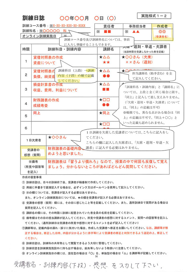 ・日直当番の方は別に訓練日誌を提出していただきます。