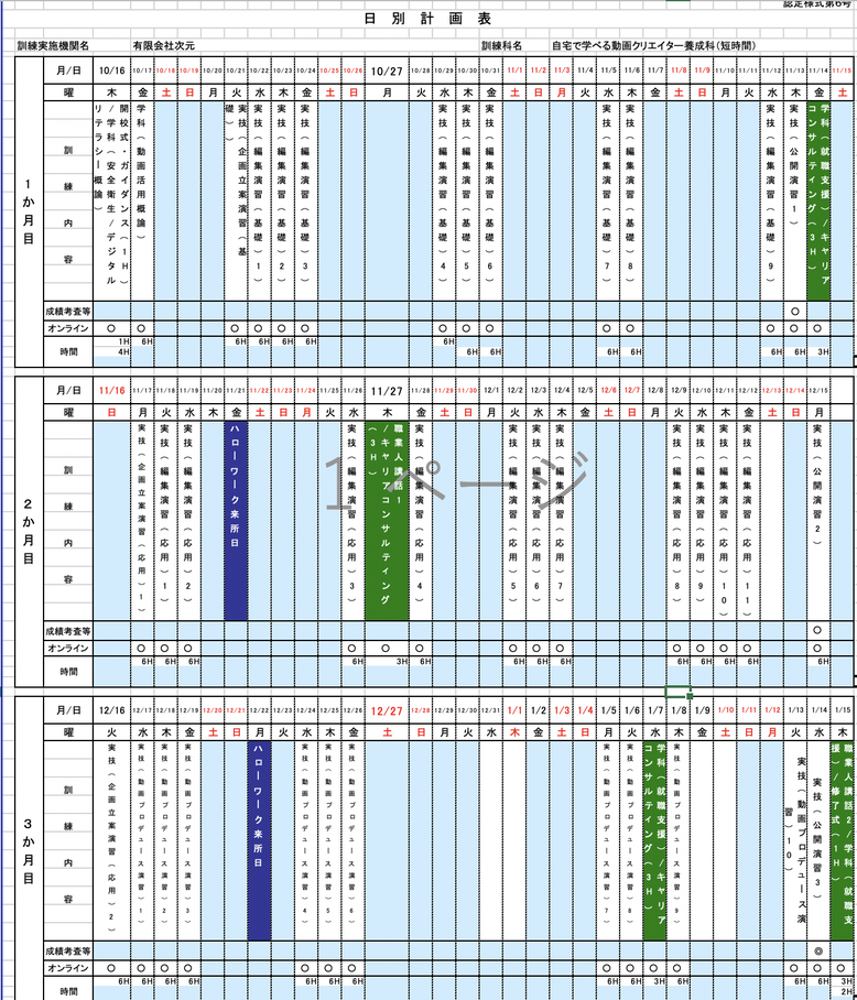 表の緑色はガイダンスや就職支援講義の日。青色は皆さんが管轄のハローワークへ行かれる日(青の日は講義はありません)。